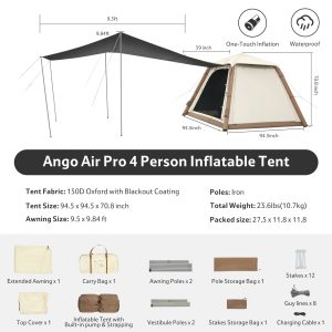 Ango™ Air Pro Inflatable Camping Tent is a fast setup, blackout shelter designed for effortless family camping, weekend getaways, and outdoor relaxation. Built with durable 150D Oxford fabric and a full airframe structure, it delivers quick assembly, excellent weather protection, and spacious comfort for groups. Its blackout design, large canopy expansion, and all-around ventilation make it an ideal basecamp from sunny summer days to rainy nights.