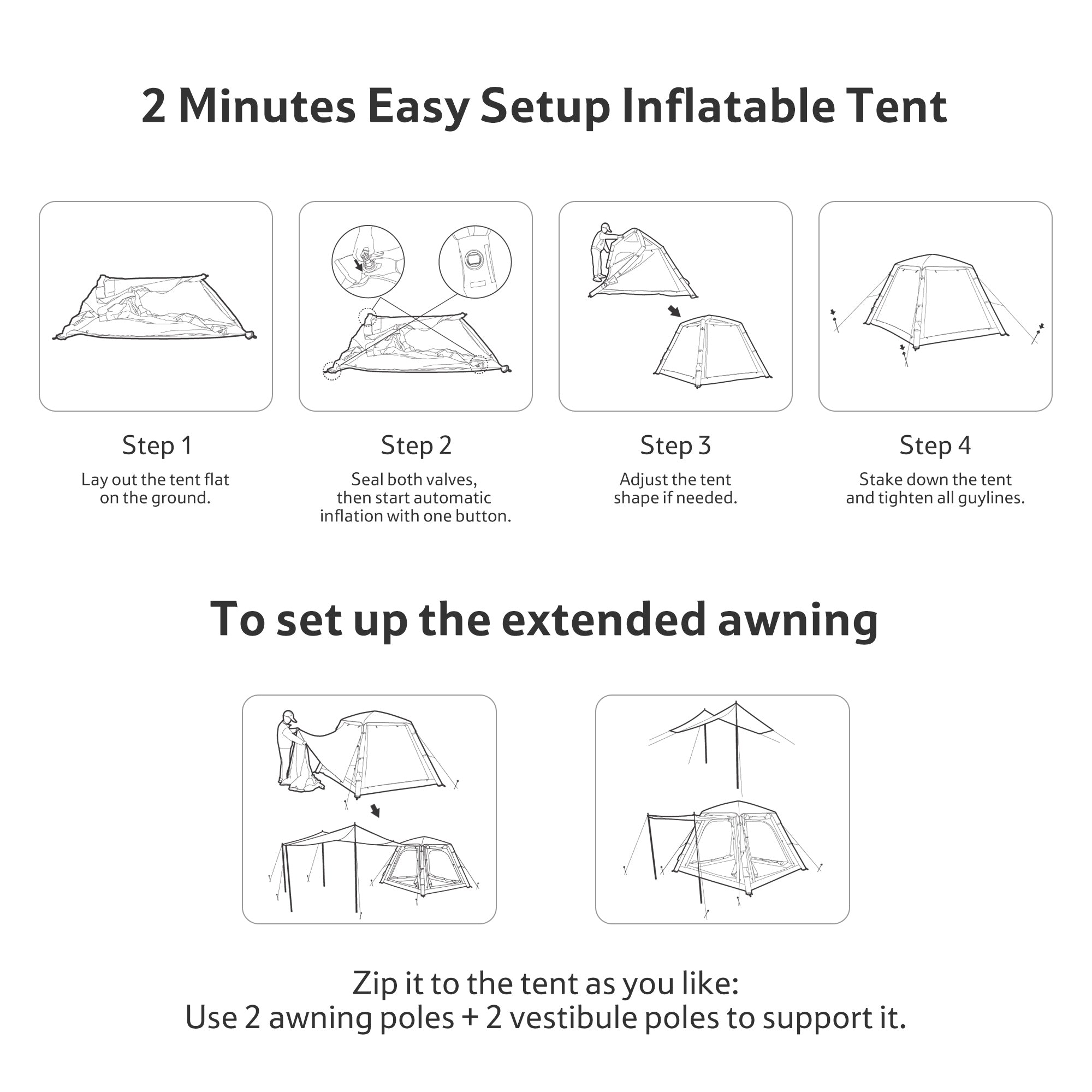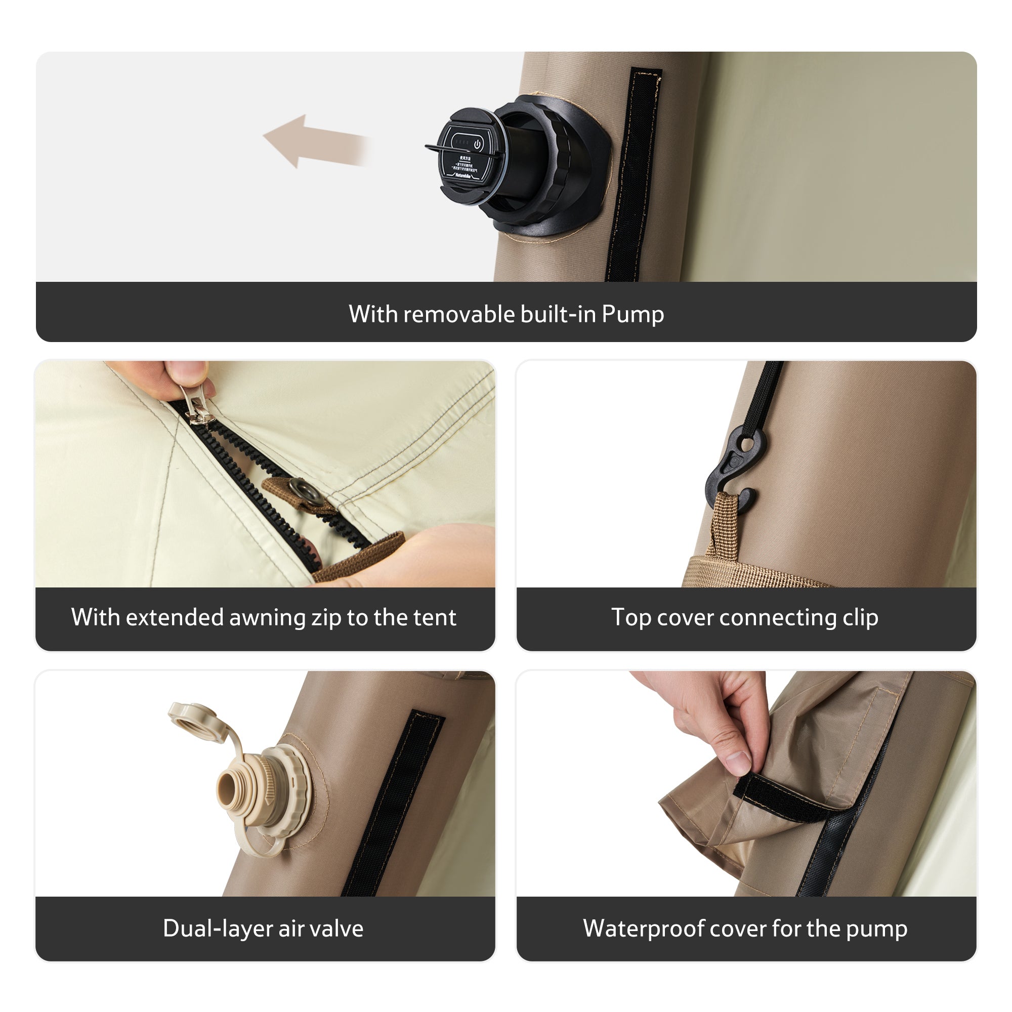 - Quick 2-Minute Setup – Features a full air-inflated frame with a removable built-in pump, eliminating the need for traditional poles. Simply inflate and secure for a complete setup that even kids can help with.